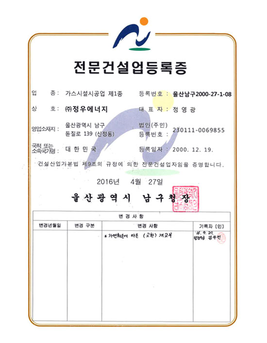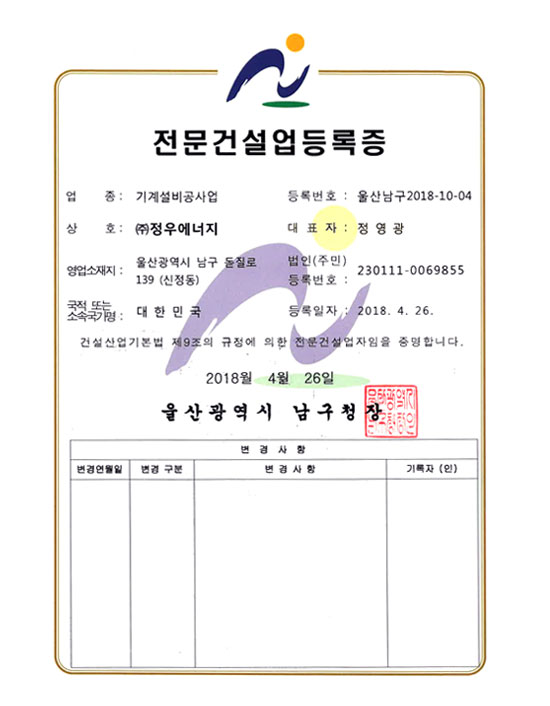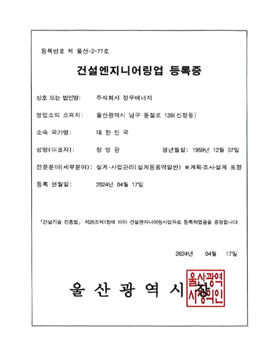 정우에너지의 각종 인증 및 관련 자격을 보유하고 있습니다.